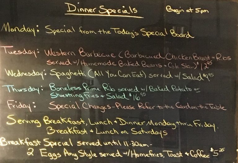 Thursday, October 12th Grilled Swiss, Turkey, Cole Slaw & Russian on Rye served with Shoestring Fries $12.95 Soup: Hungarian Mushroom Quiche: Spinach & Mushroom Homemade Desserts: Coconut Custard Pie, Chocolate Chip Cookie Pie, Maddalenas Pumpkin Cheesecake Dinner Specials – Dinner Special Friday 10/13 Homemade Beef Stroganoff over Egg Noodles served with Broccoli $16.95 Tuesday Nights – Western Barbecue (Barbecued Chicken Breast & Ribs with Homemade Baked Beans & Cole Slaw) $14.95 Wednesday Nights – Spaghetti served with salad $9.95 Thursday Nights – Boneless Prime Rib served with Baked Potato or Fries & Salad $21.95